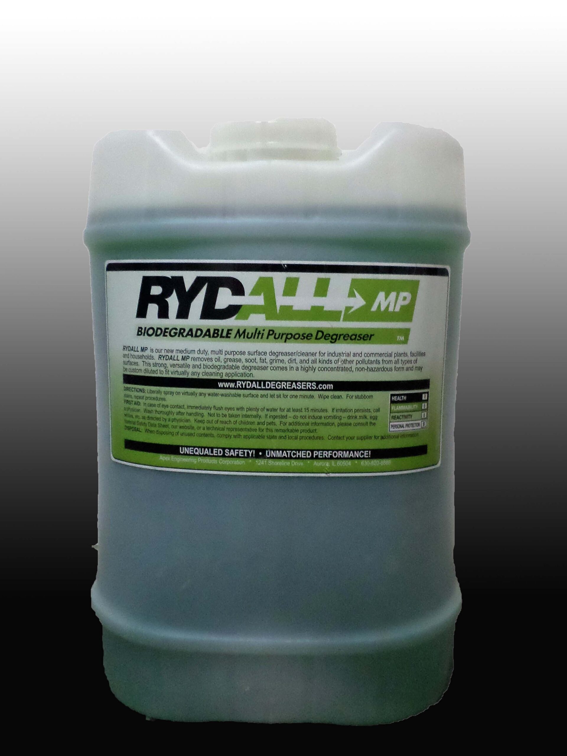 Rydall MP Multi Propósito es un desengrasante biodegradable, de servicio mediano desengrasante superficie / limpiador ideal para instalaciones industriales y comerciales, instituciones e incluso los hogares. Es rápida y segura elimina el aceite, la grasa, la suciedad y otros contaminantes de todos los tipos y componentes de la superficie. Este desengrasante / limpiador versátil es uno de los productos más fuertes, no disolventes basados en el mercado.